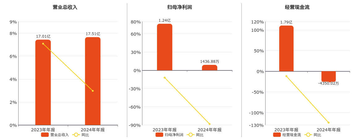 公司营业总收入为17.51亿元。归母净利润为1436.88万元,较去年同报告期归母净利润减少1.09亿元,同比较去年同期下降88.38%。经营活动现金净流入为-4350.02万元,较去年同报告期经营活动现金净流入减少2.22亿元,同比较去年同期下降124.30%。
