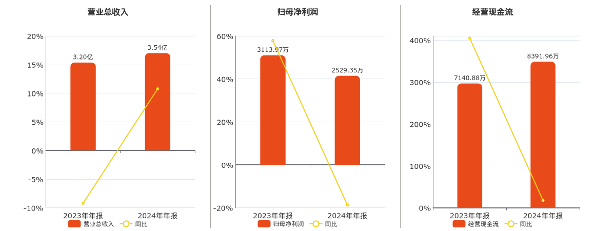 公司营业总收入为3.54亿元。归母净利润为2529.35万元,较去年同报告期归母净利润减少584.62万元,同比较去年同期下降18.77%。经营活动现金净流入为8391.96万元。