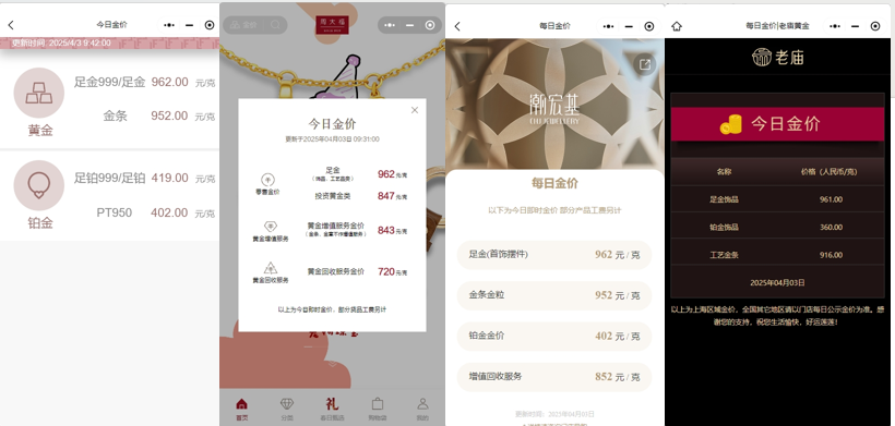 具体而言,当日上午,周大福足金(首饰、摆件类)、六福珠宝足金999/足金、潮宏基足金(首饰摆件)、周六福足金饰品境内价格达962元/克;老庙黄金上海区域足金饰品价格为961元/克。