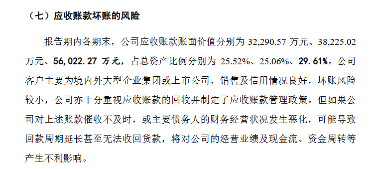 纳百川的应收账款也不断上升,报告期内各期末,公司应收账款账面价值分别为 32,290.57 万元、38,225.02万元、56,022.27 万元,占总资产比例分别为 25.52%、25.06%、29.61%。
