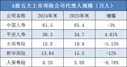 随着A股五大上市险企2024年度业绩报告悉数出炉,个险渠道最新代理人数量浮出水面。