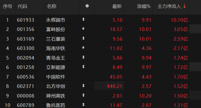 上证报中国证券网讯截至4月3日11时25分,永辉超市主力资金净流入超10亿元,位居首位。其次为,富岭股份、兰石重装、海南华铁,主力资金净流入分别为3.05亿元、2.59亿元、2.17亿元。立讯精密、歌尔股份、新易盛等个股主力资金净流出居前,分别为9亿元、8.01亿元、5.18亿元。