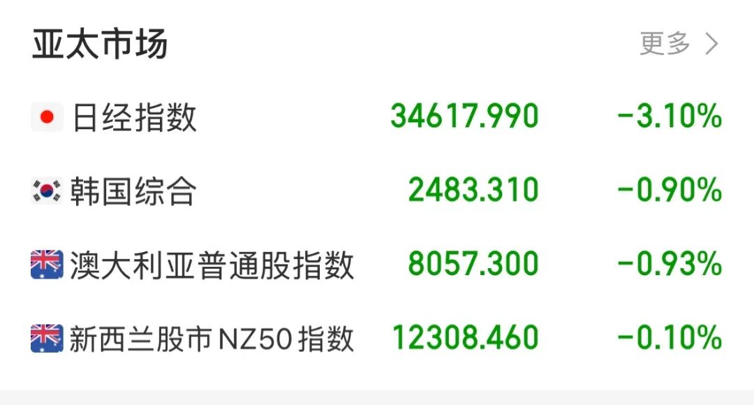 周四,亚太区股市多数走低,日经225指数一度跌超4.5%;韩国综合指数开盘跌2.7%;富时新加坡海峡指数开盘跌1%;印度SENSEX30指数开盘跌1.05%,成份股大多下跌。