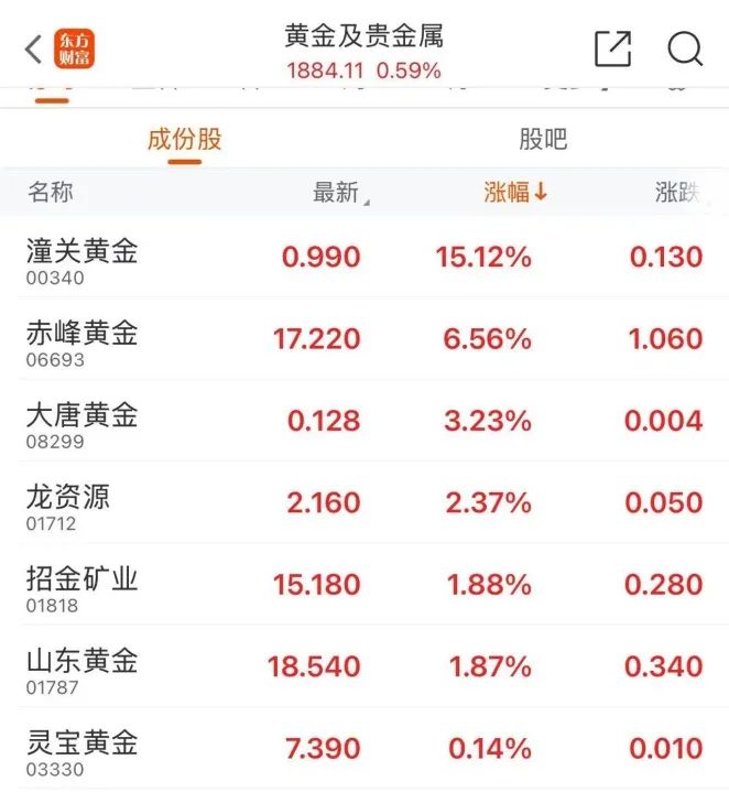 今日早盘,黄金股走高,截至发稿,潼关黄金涨超15%,赤峰黄金涨超6%,大唐黄金涨超3%,招金矿业涨超 1%。