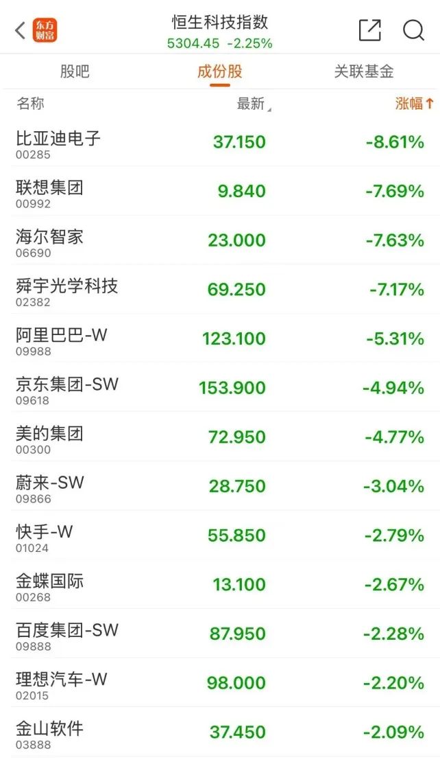 今日早盘,科技股纷纷大跌。比亚迪电子跌超8%,联想集团、海尔智家、舜宇光学科技跌超7%,阿里巴巴-W跌超5%,京东集团-SW、美的集团跌超4%。