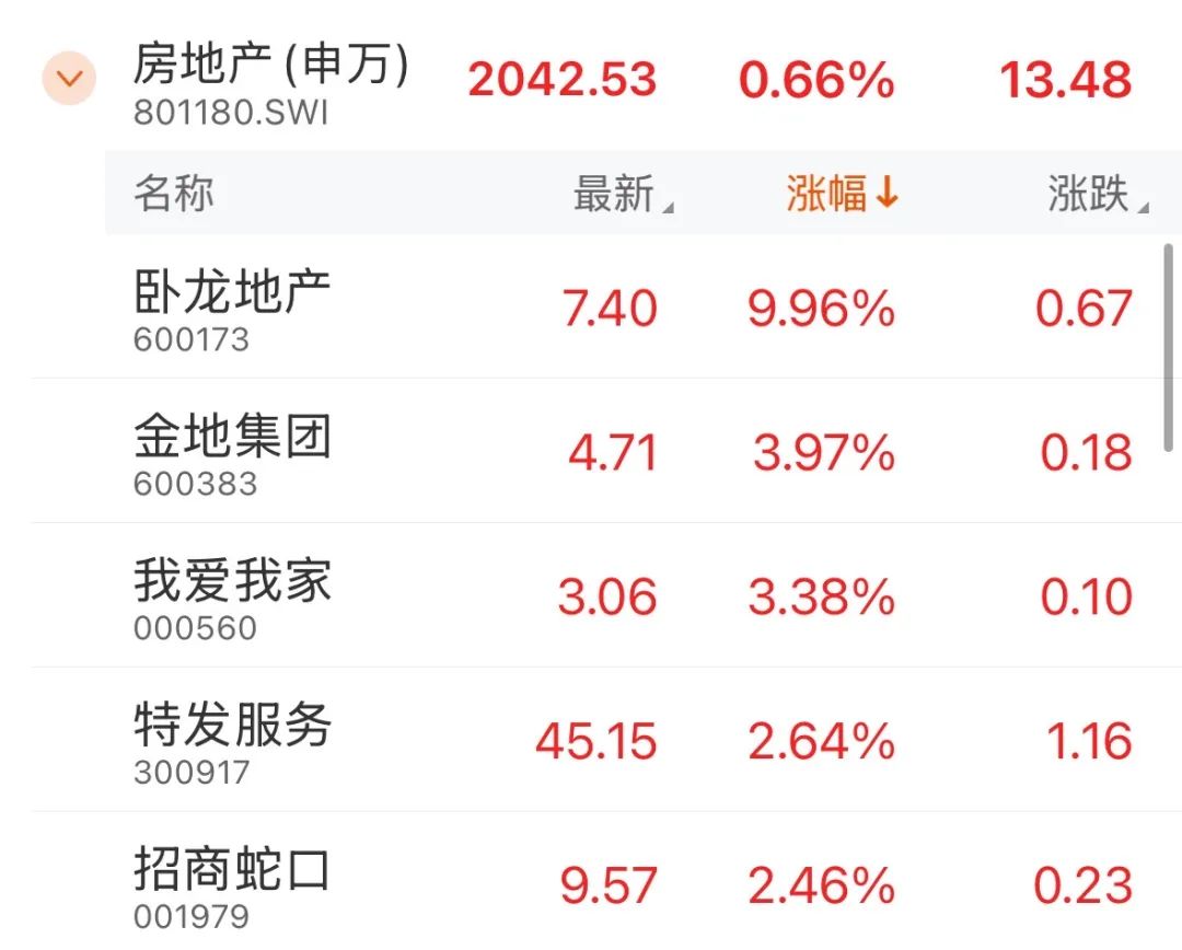 房地产板块盘中同样有所表现。截至午间收盘,卧龙地产涨停,金地集团、我爱我家、特发服务、招商蛇口等涨幅居前。