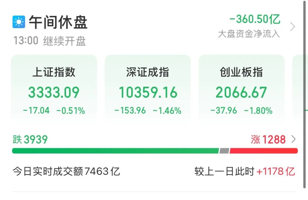 A股市场同步震荡,上证指数盘中一度翻红,随后再度回落。截至午间收盘,上证指数跌0.51%,深证成指、创业板指分别跌1.46%、1.80%。A股市场半日成交额7463亿元,较上个交易日同期大幅放量1178亿元。