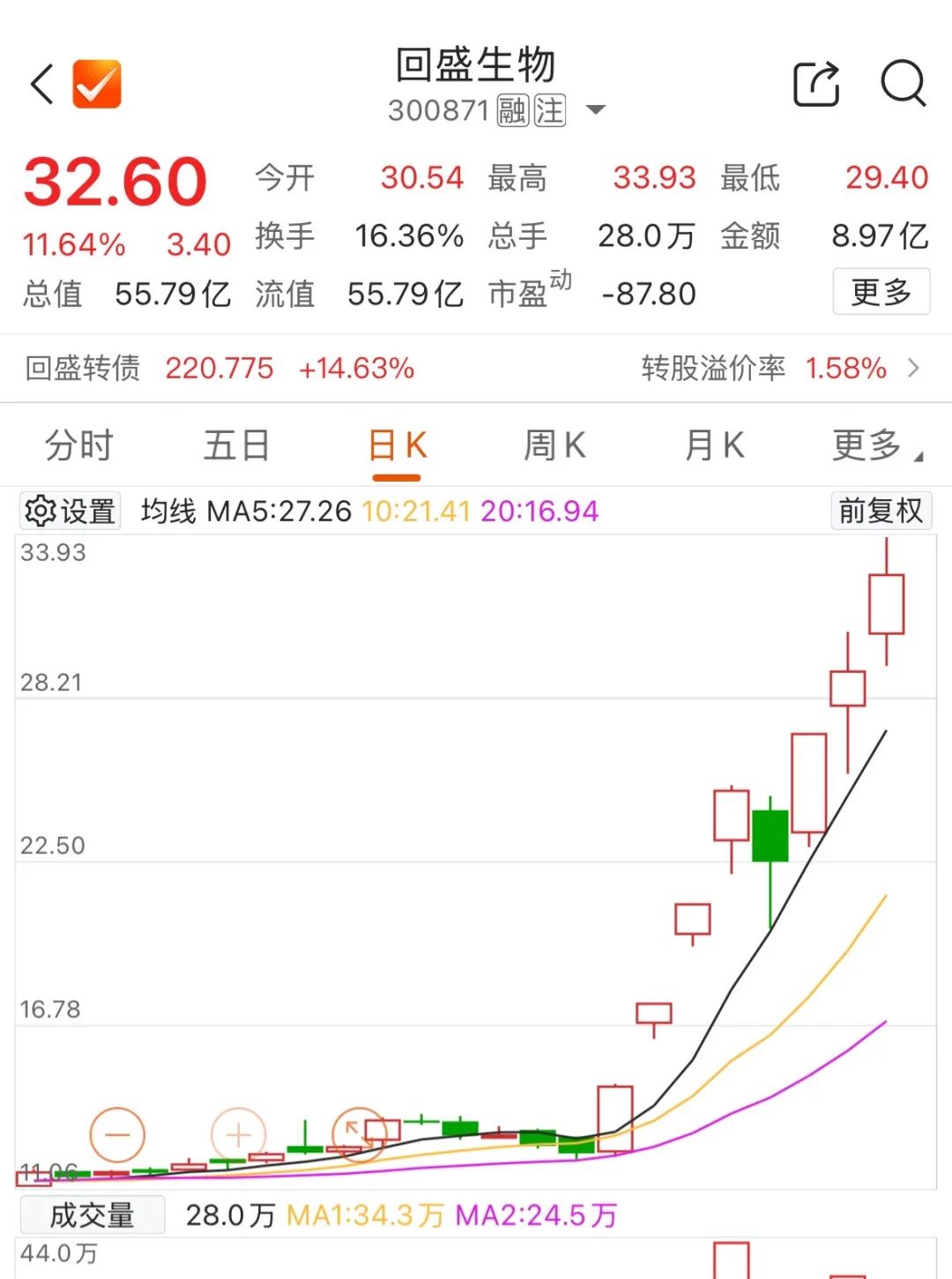 自3月25日以来,回盛生物股价一路走高,近8个交易日公司股价累计大涨166.56%。截至午间收盘,回盛生物报32.60元/股,涨11.64%,成交额8.97亿元。
