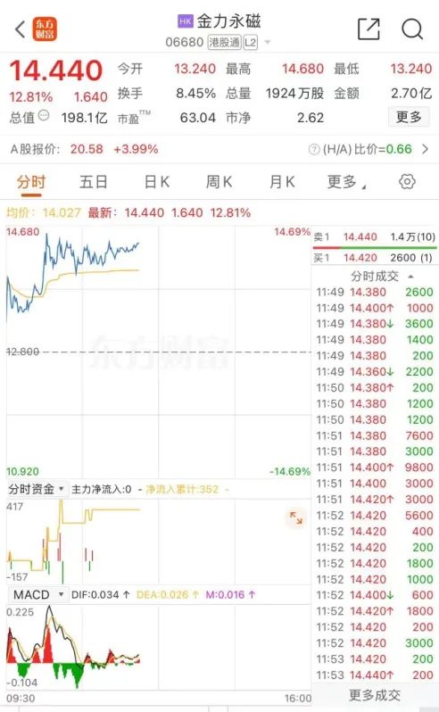 随着稀土价格逐步回升,部分资源股逆势上涨。金力永磁港股盘中一度涨超12%,现报14.44港元/股,成交额2.7亿港元。金力永磁A股涨近4%。