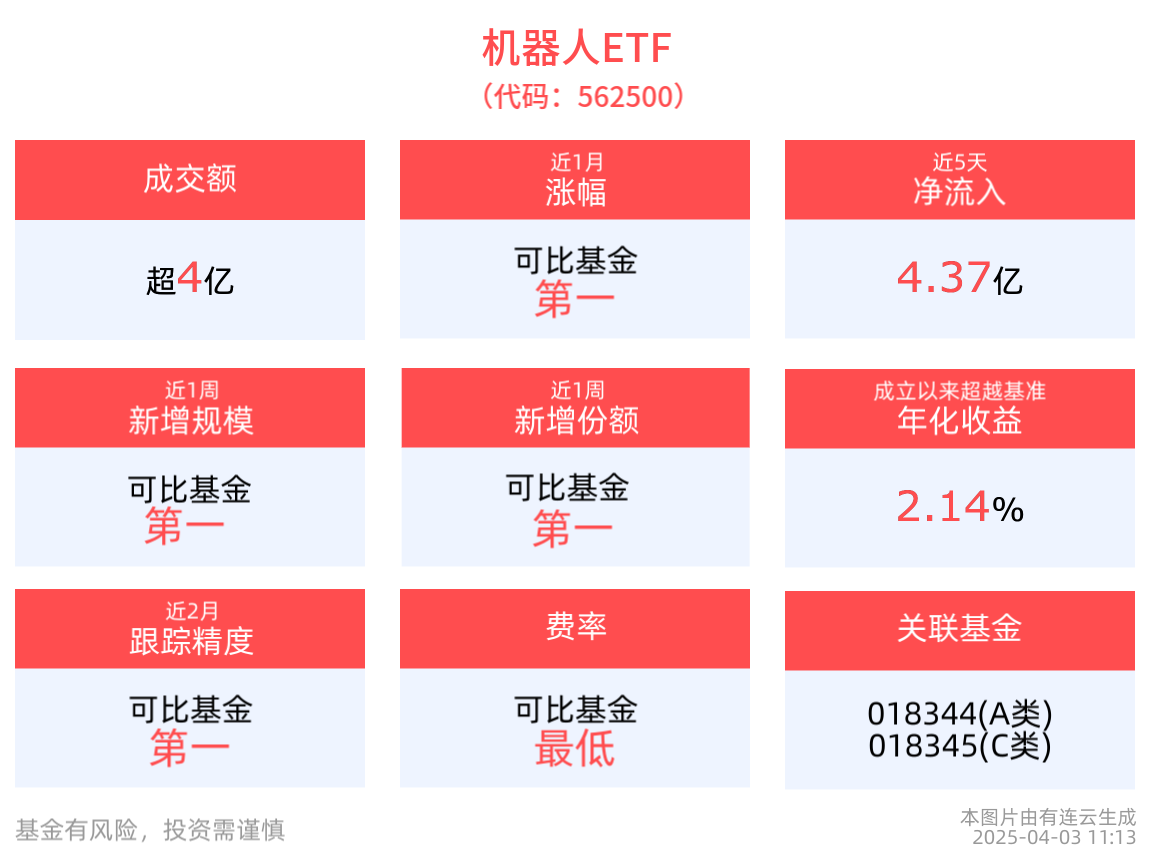 跟踪精度方面,截至2025年4月2日,机器人ETF近2月跟踪误差为0.010%,在可比基金中跟踪精度最高。