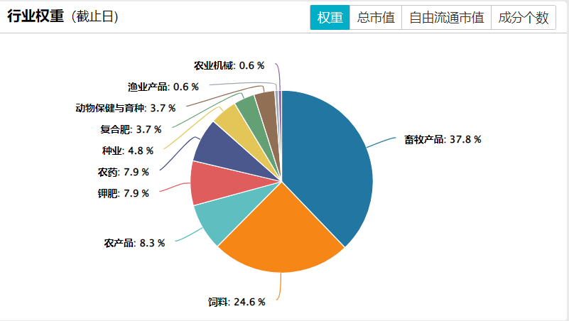 中证农业主题指数:前十大权重累计占比为61.33%,整体集中度适中。
