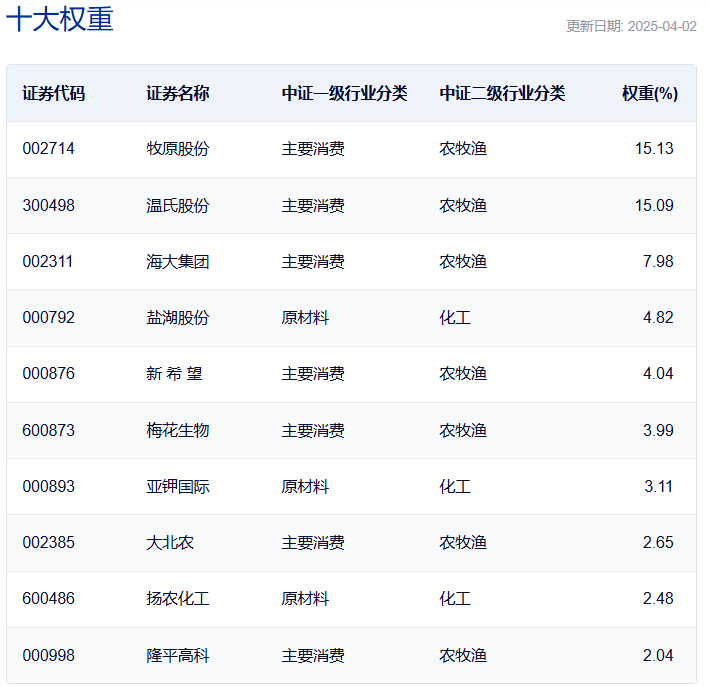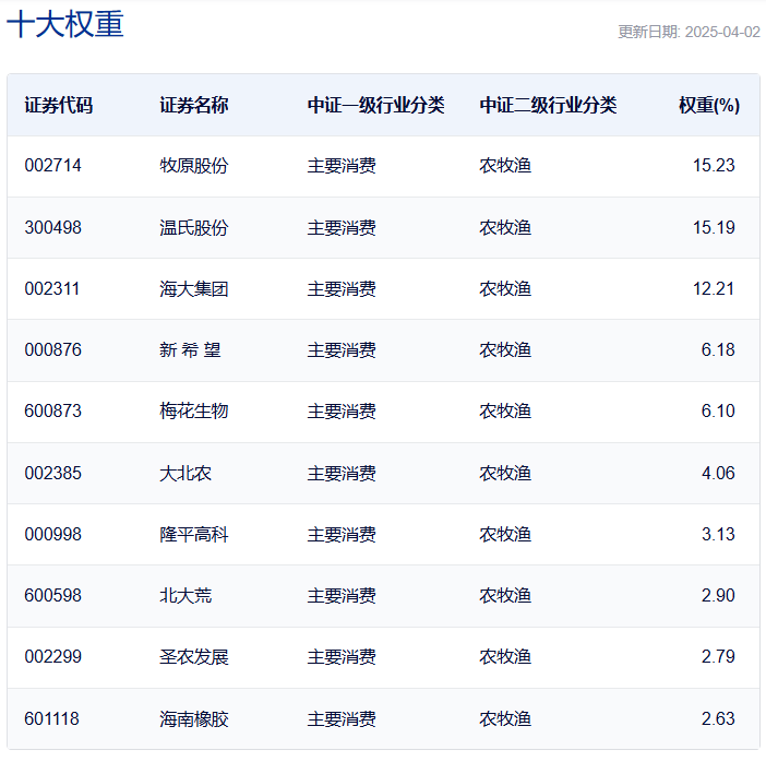 中证现代农业主题指数:前十大权重的累计占比达70.42%,整体集中度非常高。