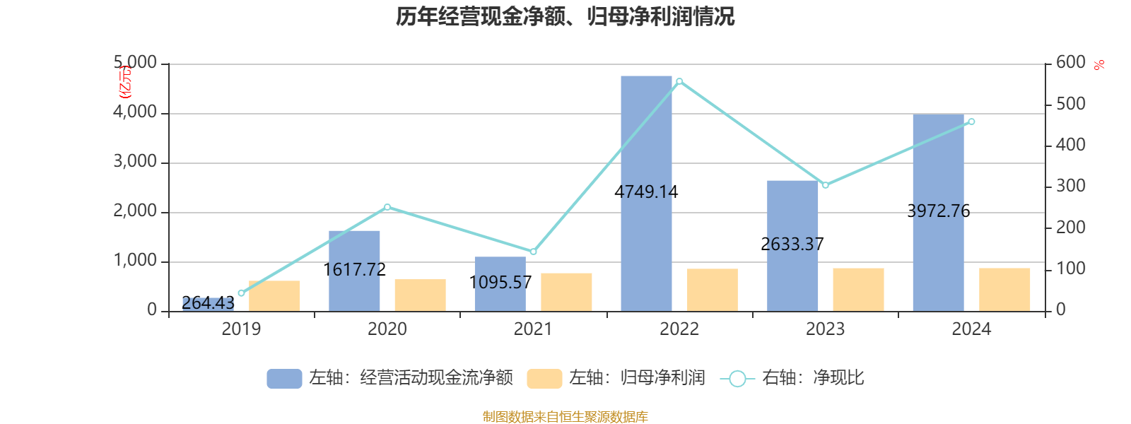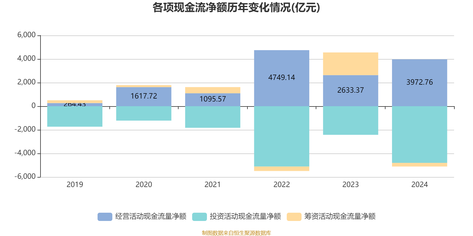 2024年,公司经营活动现金流净额为3972.76亿元,同比增长50.86%;筹资活动现金流净额-307.78亿元,同比减少2230.25亿元;投资活动现金流净额-4803.99亿元,上年同期为-2424.28亿元。