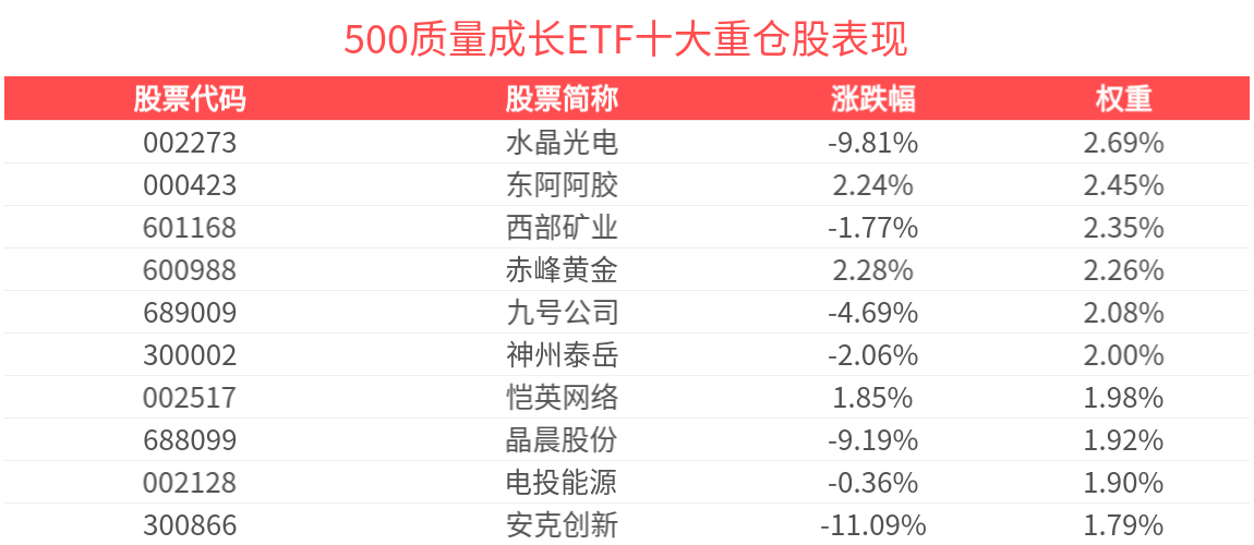 数据显示,截至2025年3月31日,中证500质量成长指数(930939)前十大权重股分别为赤峰黄金(600988)、九号公司(689009)、水晶光电(002273)、胜宏科技(300476)、西部矿业(601168)、东阿阿胶(000423)、晶晨股份(688099)、恺英网络(002517)、神州泰岳(300002)、宏发股份(600885),前十大权重股合计占比24.26%。
