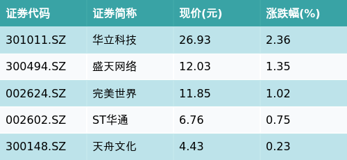 截至收盘,元宇宙主题涨跌幅最高的五只股票为:华立科技(301011.SZ)、盛天网络(300494.SZ)、完美世界(002624.SZ)、ST华通(002602.SZ)与天舟文化(300148.SZ)。详情见下表: