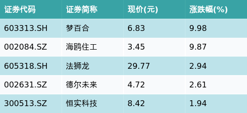 截至收盘,智能家居主题涨跌幅最高的五只股票为:梦百合(603313.SH)、海鸥住工(002084.SZ)、法狮龙(605318.SH)、德尔未来(002631.SZ)与恒实科技(300513.SZ)。详情见下表: