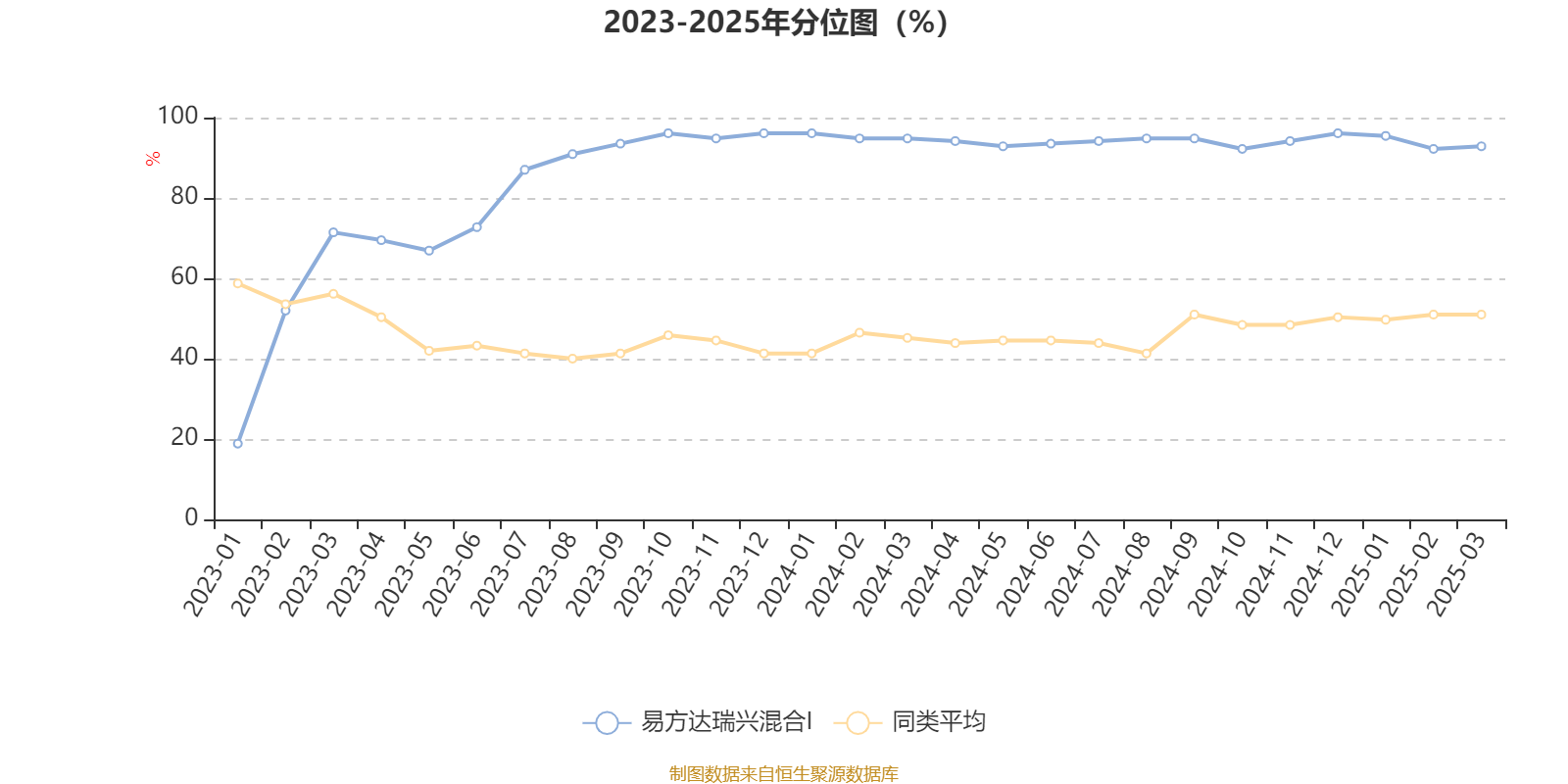 通过所选区间该基金净值增长率分位图,可以观察该基金与同类基金业绩比较情况。图为坐标原点到区间内某时点的净值增长率在同类基金中的分位数。