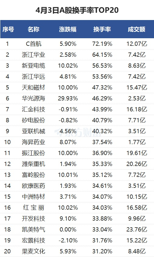 当天换手率最高的个股为C首航,全天换手率72.19%。浙江华业紧随其后,全天换手率64.15%。