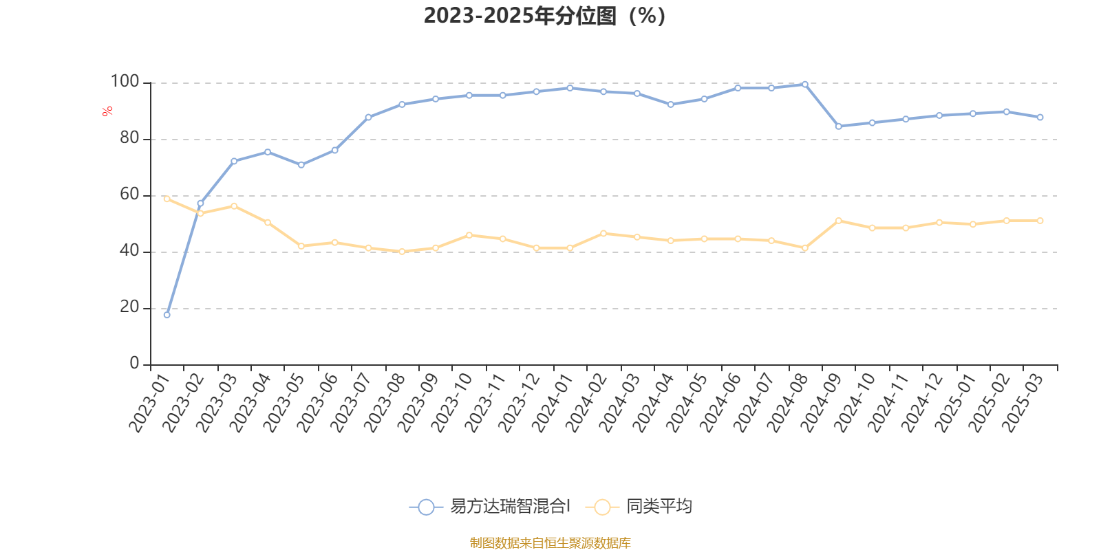通过所选区间该基金净值增长率分位图,可以观察该基金与同类基金业绩比较情况。图为坐标原点到区间内某时点的净值增长率在同类基金中的分位数。