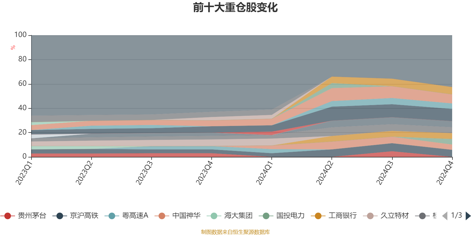 截至2024年末,基金十大重仓股分别是长江电力、陕西煤业、福耀玻璃、京沪高铁、中国石化、桂冠电力、工商银行、国投电力、中国建筑、中国神华。