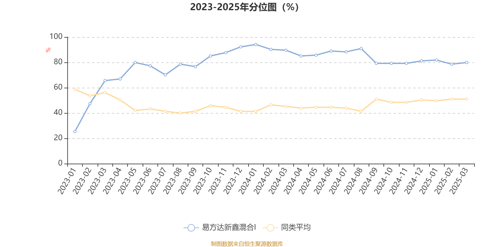通过所选区间该基金净值增长率分位图,可以观察该基金与同类基金业绩比较情况。图为坐标原点到区间内某时点的净值增长率在同类基金中的分位数。