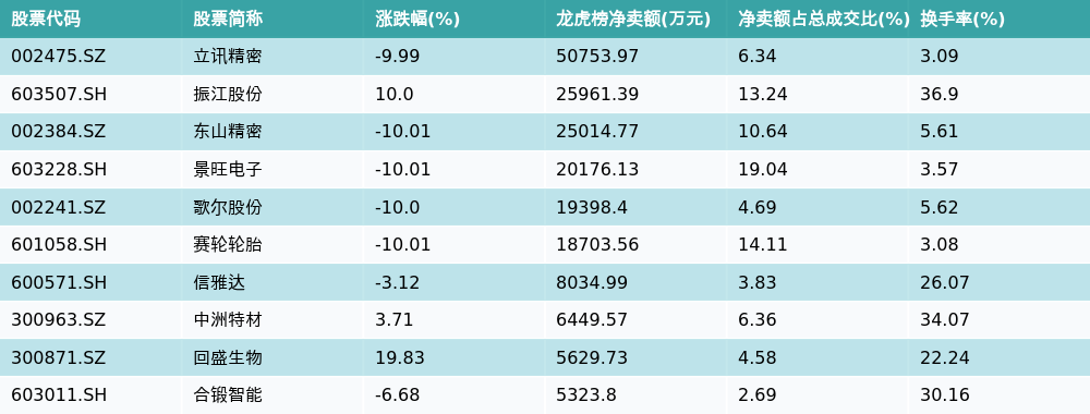 南方财经4月3日电,南财金融终端数据显示,因当日异动登上龙虎榜的个股中,龙虎榜中资金净流出最多的前三位分别是立讯精密(002475.SZ)、振江股份(603507.SH)与东山精密(002384.SZ)。其中排名第一的立讯精密被净卖出5.08亿元,占总成交金额的6.34%。立讯精密收盘下跌9.99%,换手率为3.09%。净卖出额前10个股详情见下图: