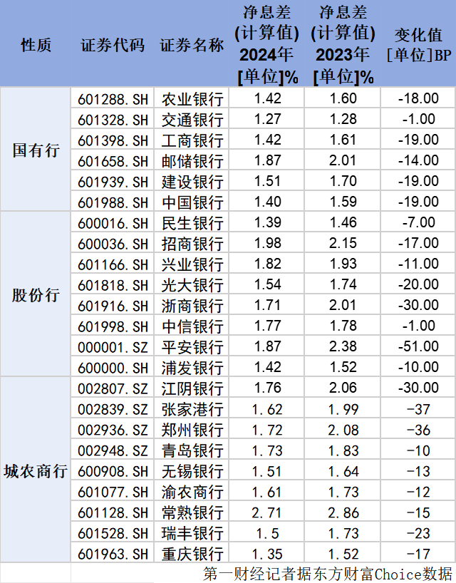 此次披露的年报数据也吻合这一趋势。按照净息差=(银行全部利息收入-银行全部利息支出)/全部生息资产计算,2024年,23家上市银行净息差全部出现下滑。2024年上市银行平均净息差为1.65%,较2023年的1.83%下降19BP。