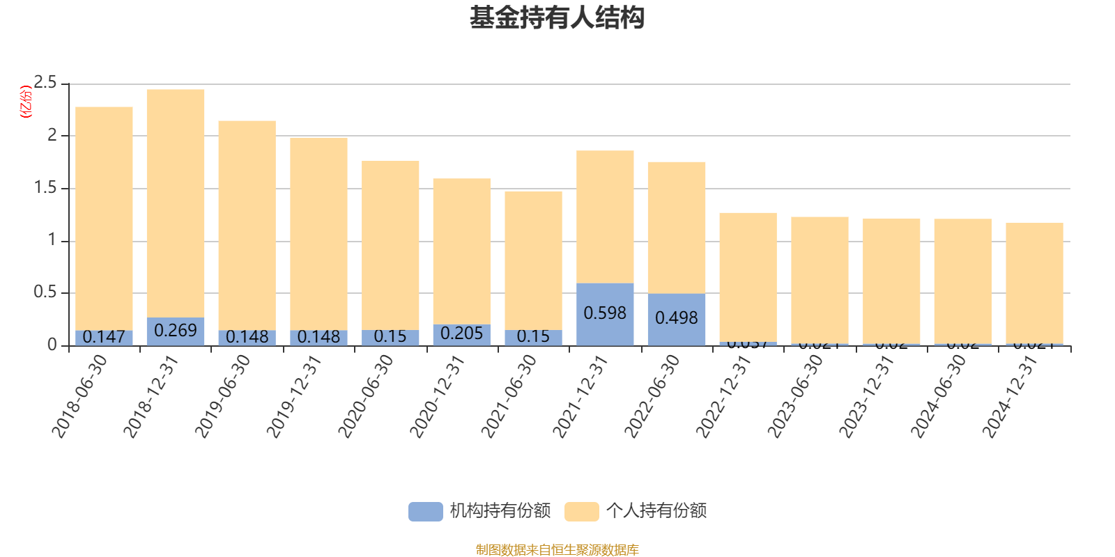 截至2024年12月31日,基金持有人共计1.08万户,合计持有1.17亿份。其中管理人员工持有2.1万份,占比0.02%,机构持有份额占比1.81%,个人投资者占比98.19%。