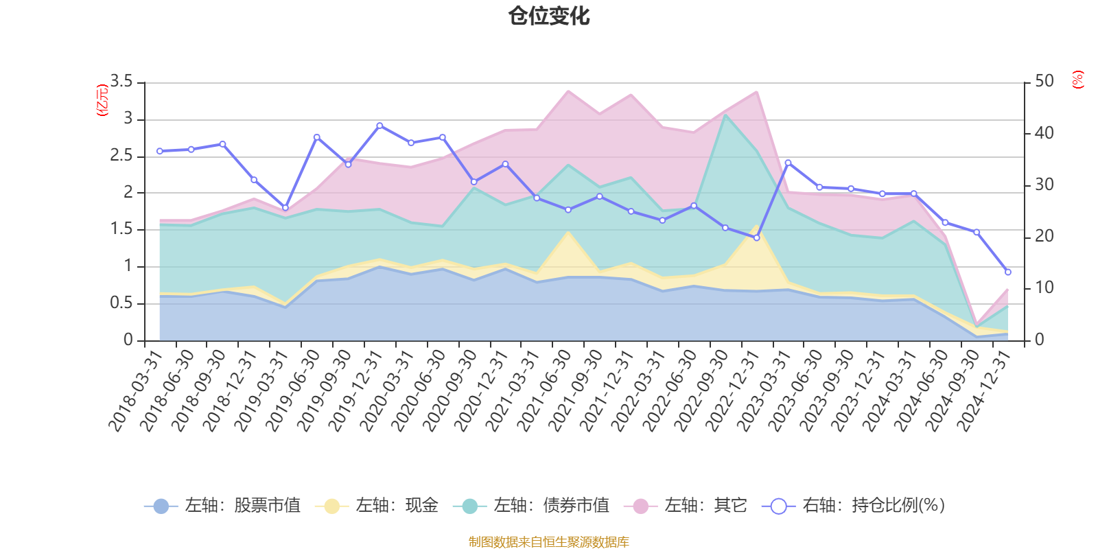 据定期报告数据统计,近三年平均股票仓位为24.91%,同类平均为41.78%。2019年末基金达到41.62%的最高仓位,2024年末最低,为13.28%。