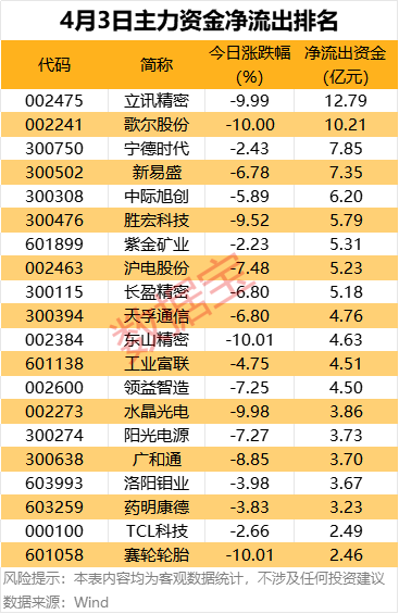 18股主力资金净流出超3亿元。其中立讯精密、歌尔股份主力资金分别大幅净流出12.79亿元、10.21亿元;宁德时代、新易盛、中际旭创等主力资金净流出金额也居前。