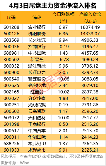 个股方面,农业银行、杭钢股份尾盘均获主力资金抢筹超亿元;长久物流、招商银行、中芯国际、新易盛均获主力资金抢筹超4000万元。