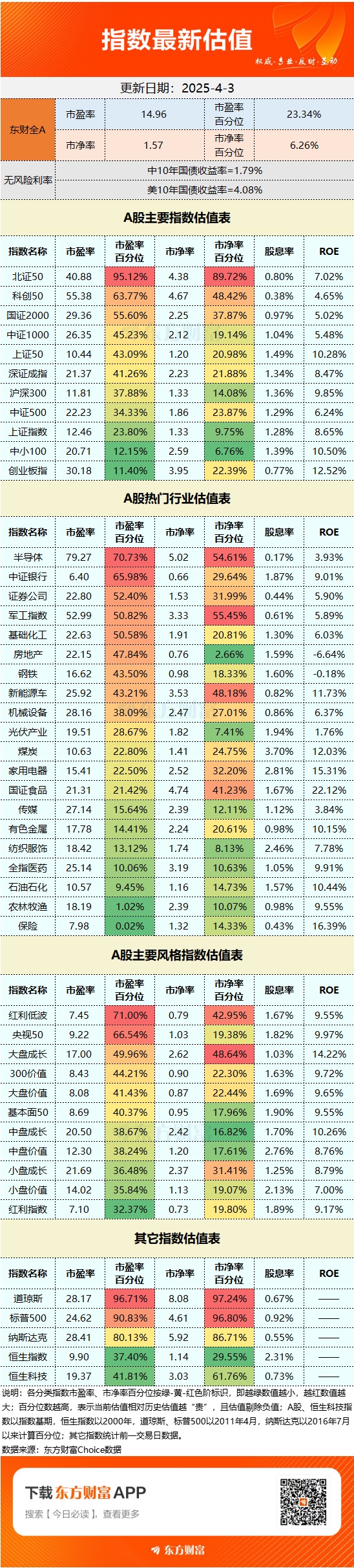截至4月3日收盘,东方财富Choice数据显示,东财全A市盈率为14.96倍,市盈率百分位为23.34%;市净率为1.57倍,市净率百分位6.26%。