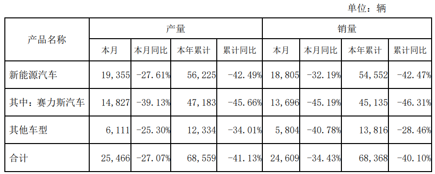 4月3日,赛力斯(601127)发布公告,披露了2025年3月份的产销快报。根据公告,新能源汽车的产量为1.94万辆,同比下降27.61%;销量为1.88万辆,同比下降32.19%。2025年累计生产新能源汽车5.62万辆,同比下降42.49%;累计销量为5.46万辆,同比下降42.47%。