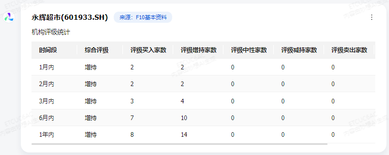 截至2025年4月3日,永辉超市的机构评级情况显示,近1月内有4家机构给出评级,其中买入评级2家,增持评级2家,综合评级为“增持”。这一评级趋势在近2月内保持不变,同样为4家机构给出评级,买入和增持评级各占一半。近3月内,评级机构数量增加至7家,买入评级3家,增持评级4家,继续保持“增持”综合评级。近6月内,17家机构参与评级,买入评级7家,增持评级10家,综合评级仍为“增持”。近1年内,22家机构给出评级,买入评级8家,增持评级14家,综合评级同样为“增持”。