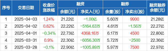 融资方面,当日融资买入5171.15万元,融资偿还1.52亿元,融资净偿还1亿元,净偿还额两市排名第11。融券方面,融券卖出1.04万股,融券偿还500股,融券余量5.6万股,融券余额610.34万元。融资融券余额合计21.28亿元。