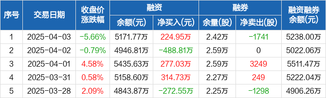 融资方面,当日融资买入1129.5万元,融资偿还904.55万元,融资净买入224.95万元。融券方面,融券卖出0股,融券偿还1741股,融券余量2.42万股,融券余额66.23万元。融资融券余额合计5238万元。