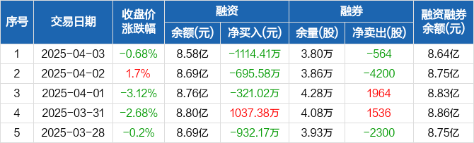 融资方面,当日融资买入3044.11万元,融资偿还4158.52万元,融资净偿还1114.41万元,连续3日净偿还累计2131.02万元。融券方面,融券卖出236股,融券偿还800股,融券余量3.8万股,融券余额554.26万元。融资融券余额合计8.64亿元。