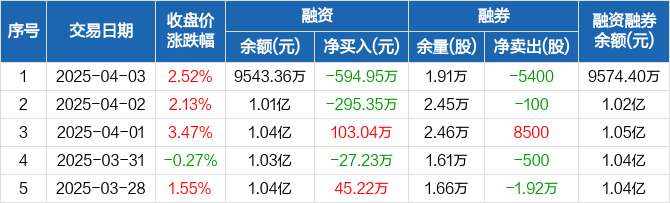 融资方面,当日融资买入1508.97万元,融资偿还2103.92万元,融资净偿还594.95万元。融券方面,融券卖出0股,融券偿还5400股,融券余量1.91万股,融券余额31.04万元。融资融券余额合计9574.4万元。