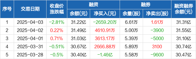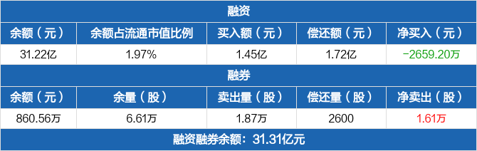 融资方面,当日融资买入1.45亿元,融资偿还1.72亿元,融资净偿还2659.2万元。融券方面,融券卖出1.87万股,融券偿还2600股,融券余量6.61万股,融券余额860.56万元。融资融券余额合计31.31亿元。