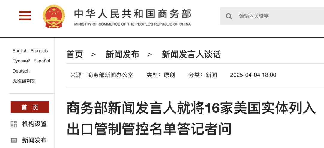 问:2025年4月4日,商务部宣布将16家美国实体列入出口管制管控名单,请问有何考虑?