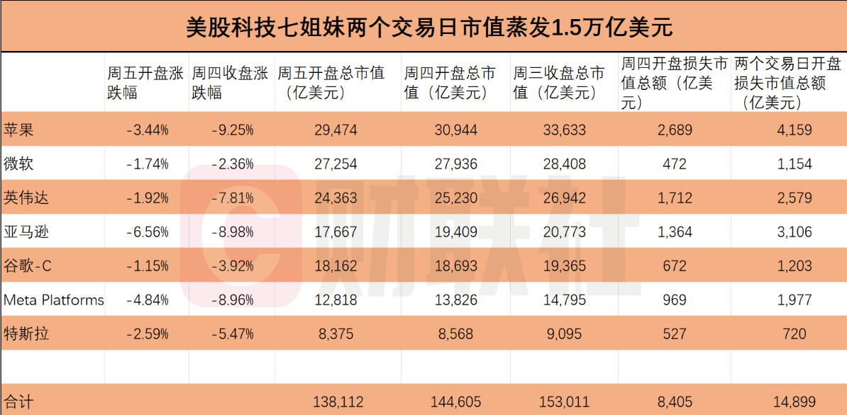 周五美股开盘继续下挫,美国科技七巨头无一幸免。万得美国科技七巨头指数今日开盘下跌3.1%,今年累计下跌超22%。经统计,近两个交易日(周三收盘至周五开盘),有着美股“七姐妹”之称的苹果、英伟达、Meta、谷歌、微软、亚马逊、特斯拉等7只股票总市值蒸发14900亿美元。苹果公司在这波下跌中损失最大,这家科技巨头市值减少4159亿美元,已不足3万亿美元。亚马逊次之,市值损失3106亿美元。英伟达则总蒸发2579亿美元,为第三惨烈个股。其他四只股票,总市值蒸发720亿美元-2000亿美元不等。
