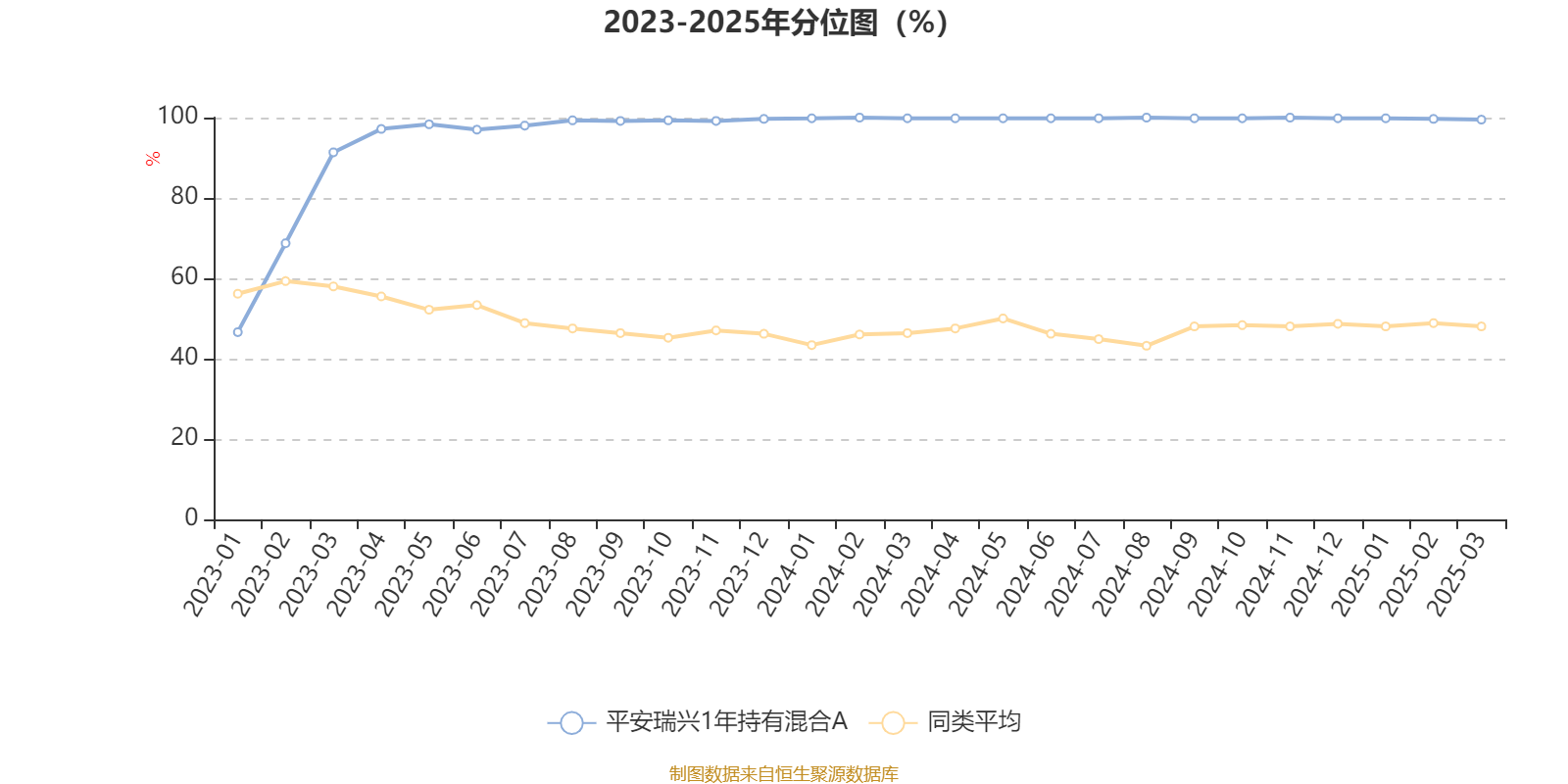 通过所选区间该基金净值增长率分位图,可以观察该基金与同类基金业绩比较情况。图为坐标原点到区间内某时点的净值增长率在同类基金中的分位数。