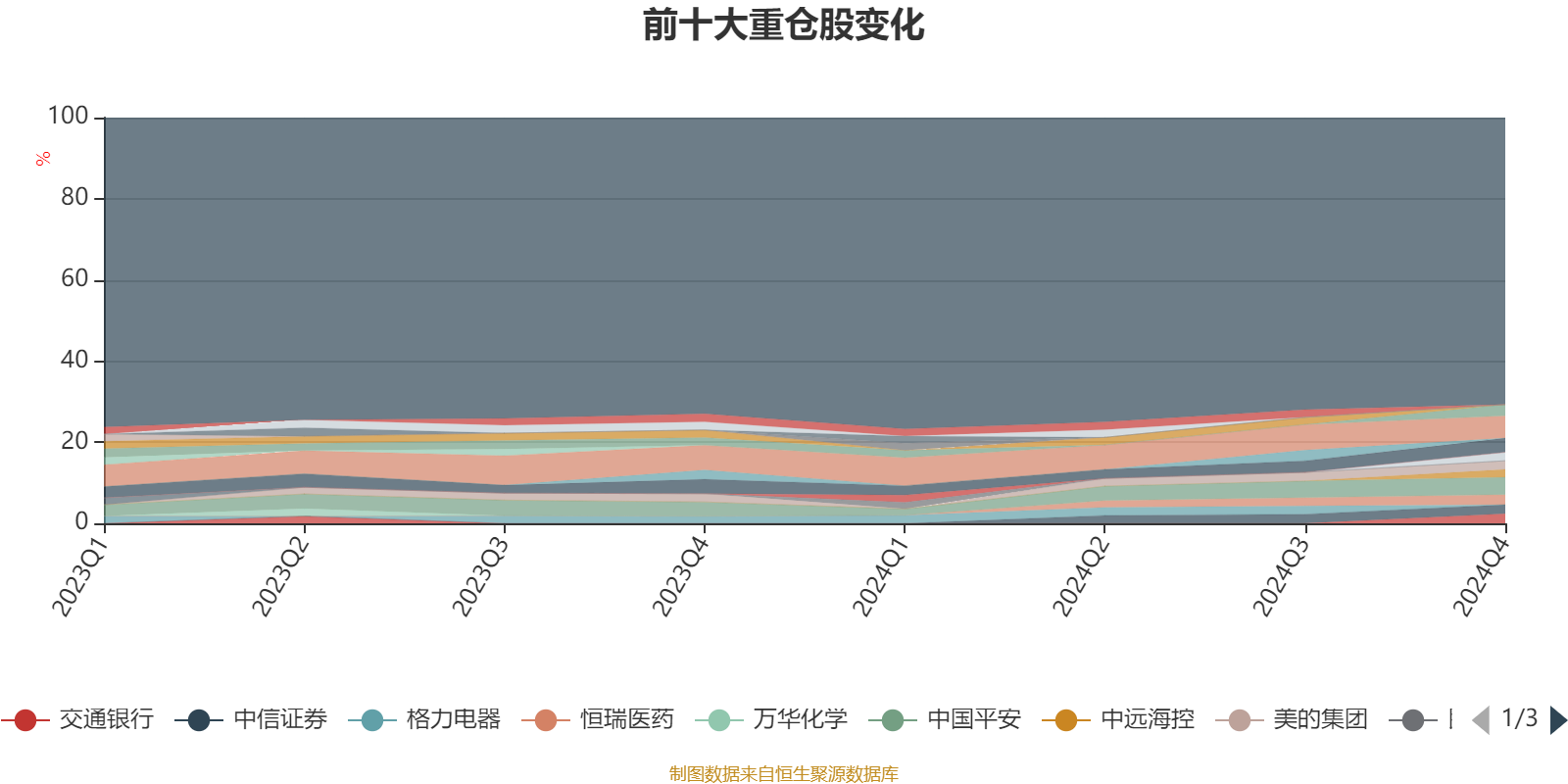 截至2024年末,基金十大重仓股分别是贵州茅台、中国平安、宁德时代、比亚迪、恒瑞医药、交通银行、中信证券、美的集团、浦发银行、中远海控。
