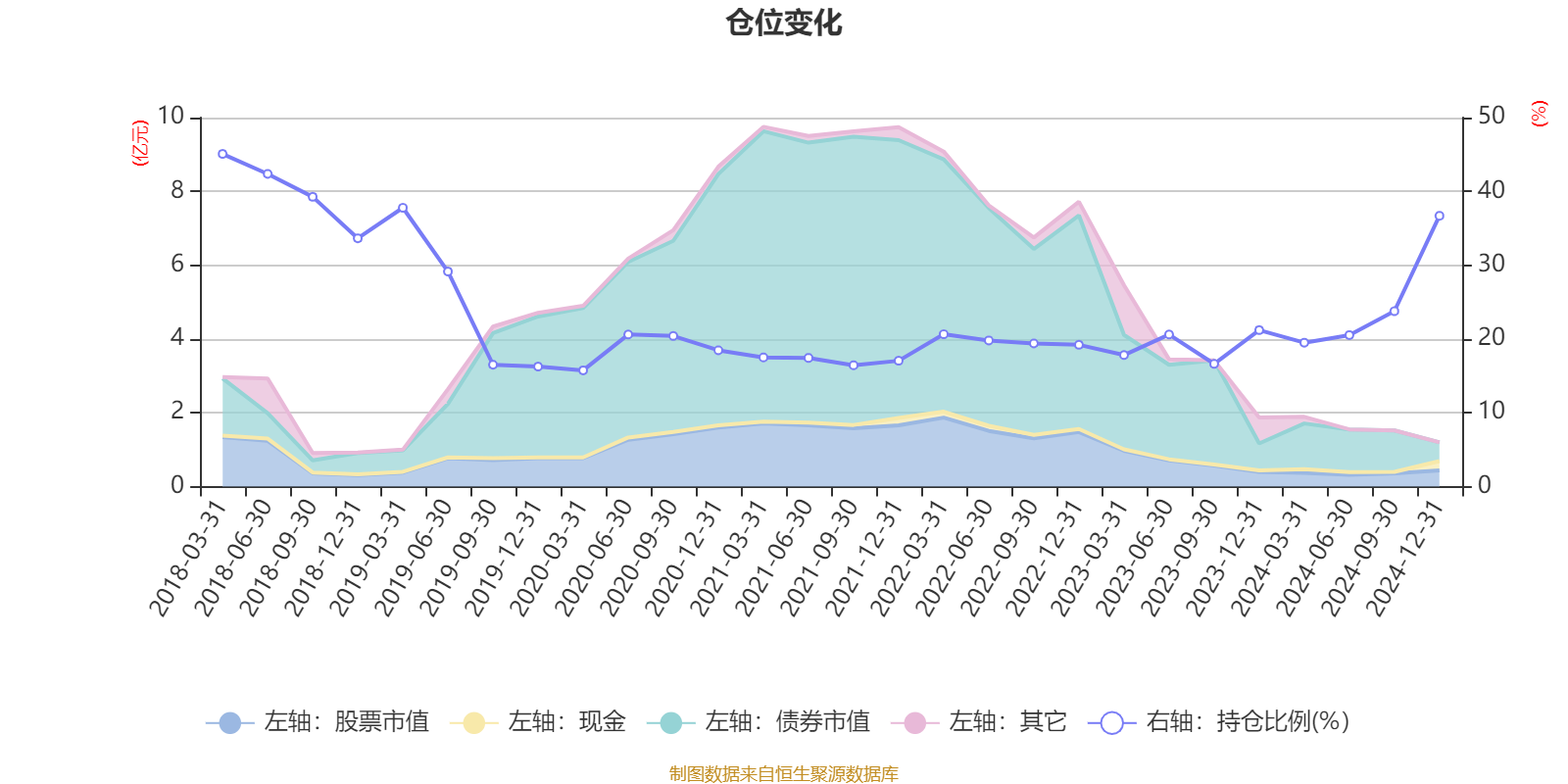 据定期报告数据统计,近三年平均股票仓位为21.32%,同类平均为41.78%。2018年一季度末基金达到45.08%的最高仓位,2020年一季度末最低,为15.75%。