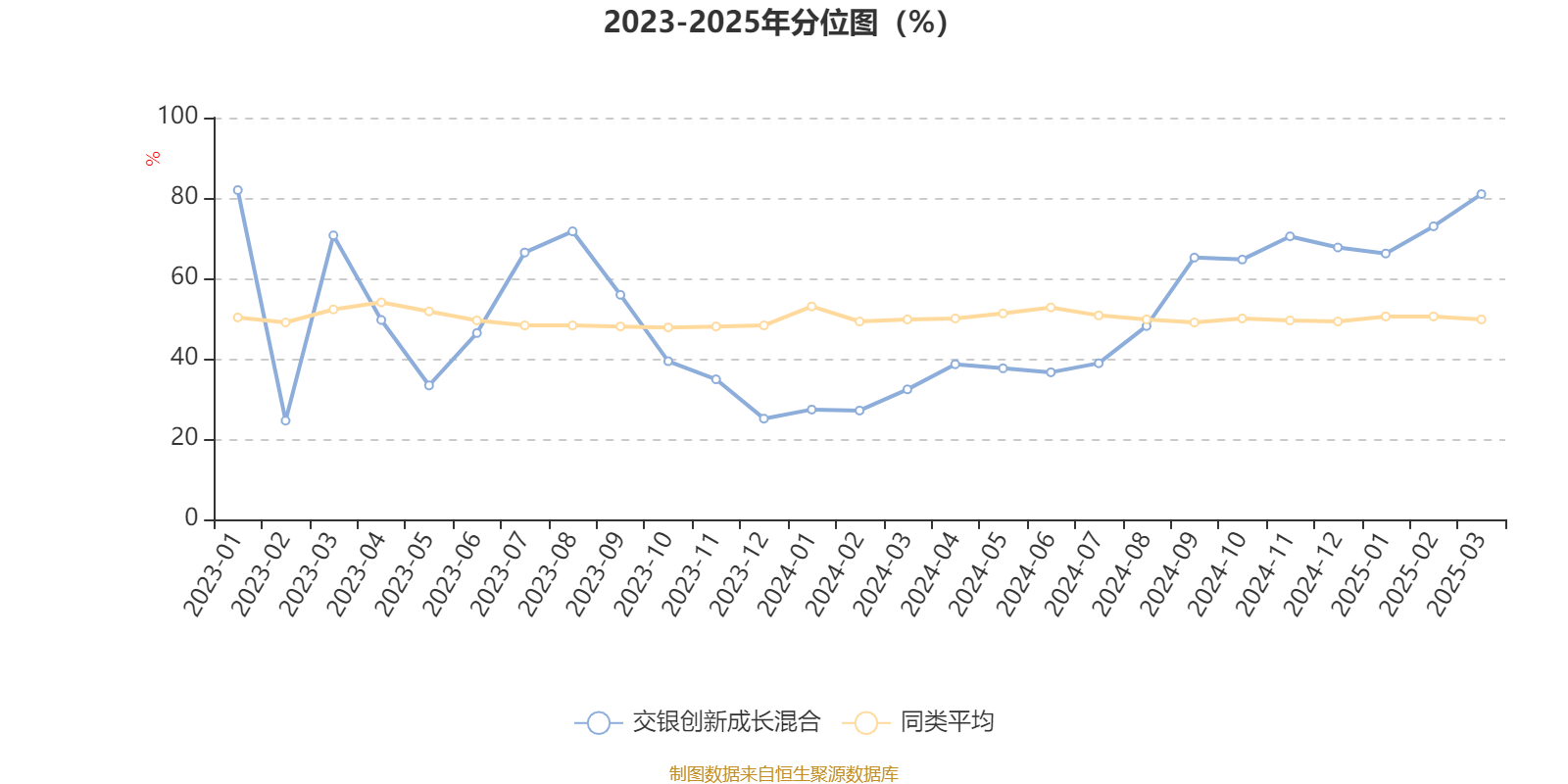 通过所选区间该基金净值增长率分位图,可以观察该基金与同类基金业绩比较情况。图为坐标原点到区间内某时点的净值增长率在同类基金中的分位数。