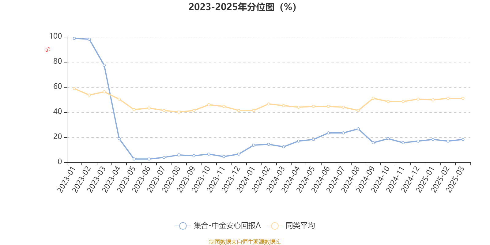 通过所选区间该基金净值增长率分位图,可以观察该基金与同类基金业绩比较情况。图为坐标原点到区间内某时点的净值增长率在同类基金中的分位数。