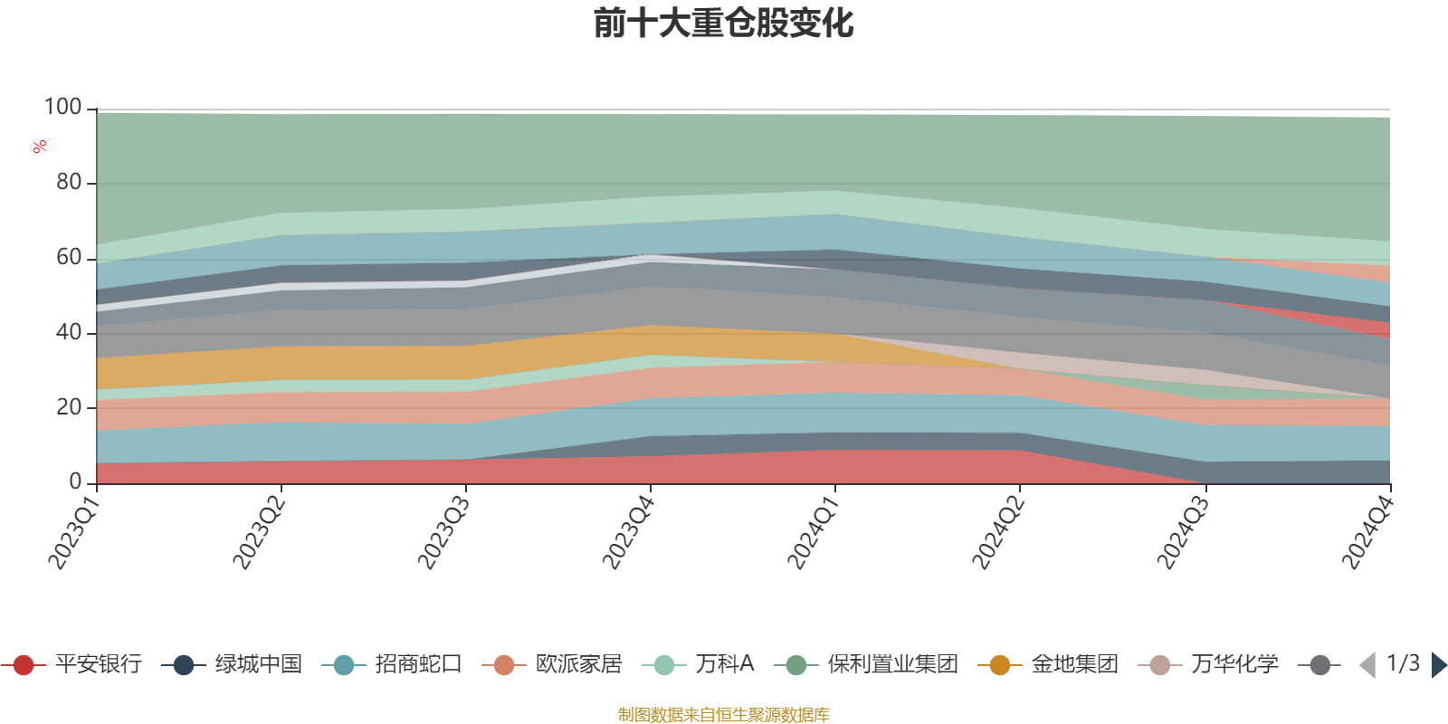 该基金持股集中度较高,且持股标的较为稳定,近2年前十大重仓股集中度长期超过60%。截至2024年末,基金十大重仓股分别是招商蛇口、保利发展、欧派家居、中国平安、中国海外发展、顾家家居、绿城中国、华泰证券、华发股份、恒生电子。