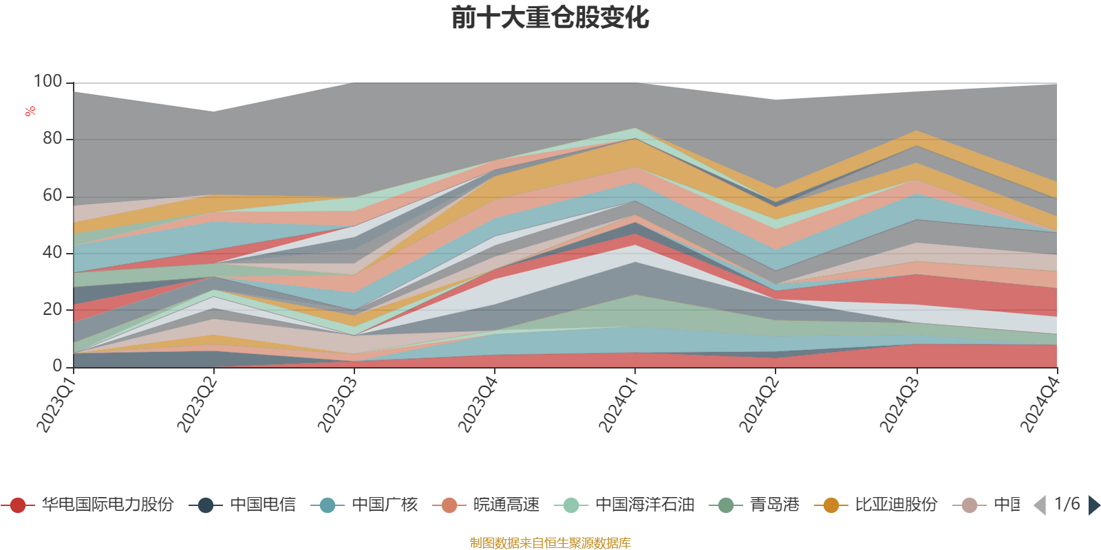 该基金持股集中度较高。截至2024年末,基金十大重仓股分别是中广核电力、华电国际电力股份、华能国际电力股份、华润电力、国投电力、中国移动、福能股份、申能股份、浙能电力、青岛港。