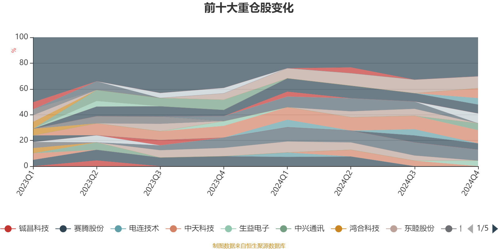 截至2024年末,基金十大重仓股分别是中际旭创、新易盛、天孚通信、胜宏科技、申菱环境、沪电股份、海光信息、中科蓝讯、亨通光电、生益电子。