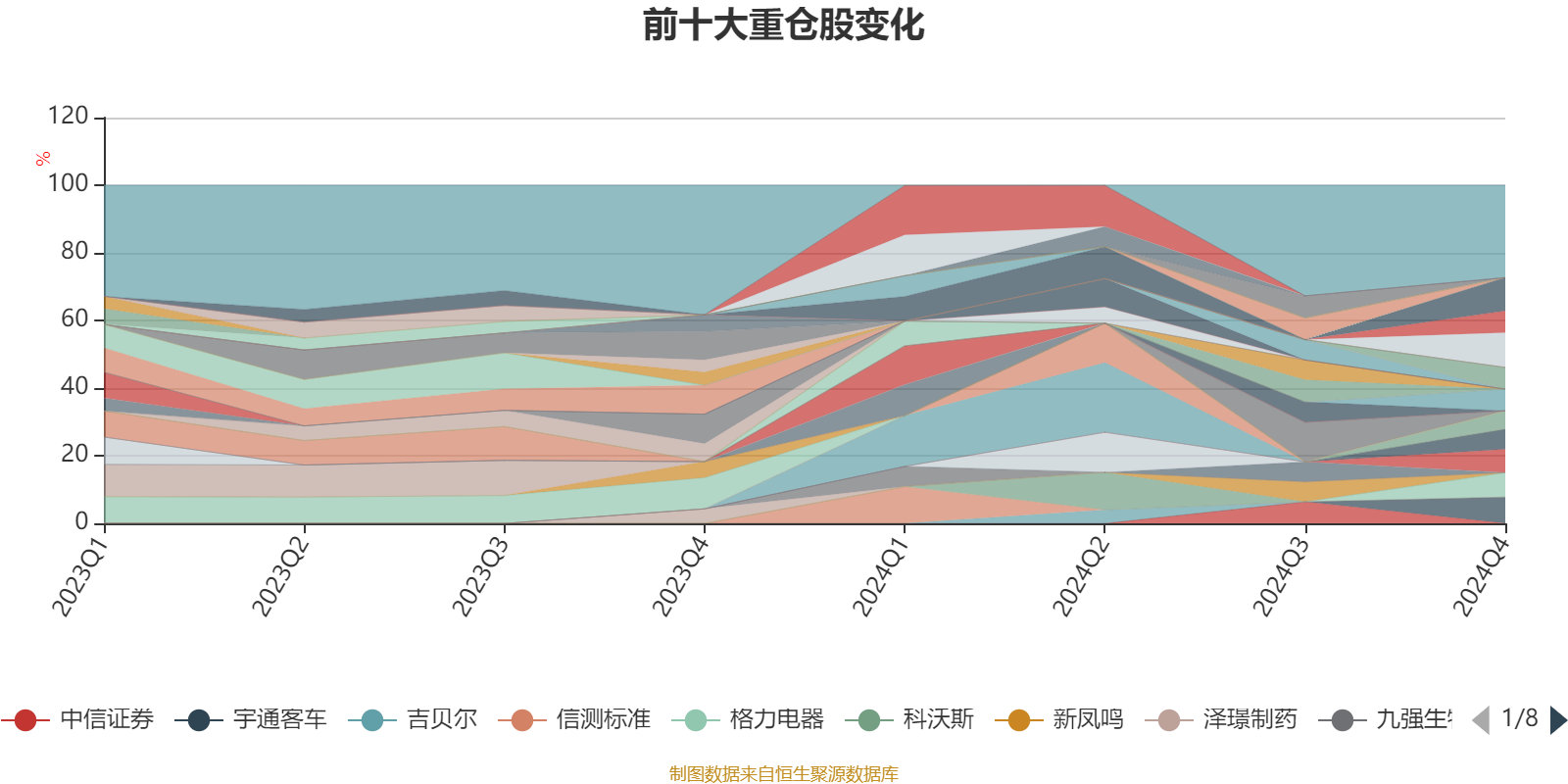 该基金持股集中度较高,近2年前十大重仓股集中度长期超过60%。截至2024年末,基金十大重仓股分别是中国海油、巨星科技、宇通客车、格力电器、皖通高速、中国神华、申能股份、长江电力、工商银行、中国石化。